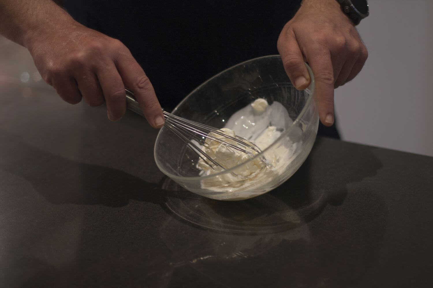 1. Lo mejor es preparar la crema de queso con antelación y conservarla en la nevera. De este modo, se endurecerá y será más fácil de untar cuando vayamos a montar el canapé.