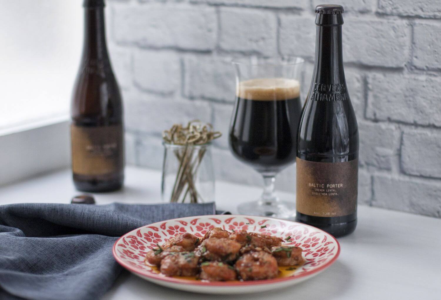 Para maridar esta receta llena de contastres agridulces, la plenitud de cuerpo en boca de una Alhambra Baltic Porter, con amargo suave y moderado y una textura sedosa, será el contrapunto idóneo que completará el dulzor de este plato. Incluso las señas de identidad de esta variedad de cerveza, su color marrón oscuro casi negro, profundo e intenso, y su corona de espuma, firme y consistente de tonalidades chocolate, convierten en todavía más apetecible la carne jugosa de los gambones.